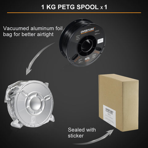 Overture PETG filaments are made of premium PETG resin which combines the advantages of PLA and ABS such as odorless, esay-to-print, little shrinkage rate; Outstanding toughness and high impact strength; Good liquidity (flows smoothly); High mechanical strength and excellent flexibility